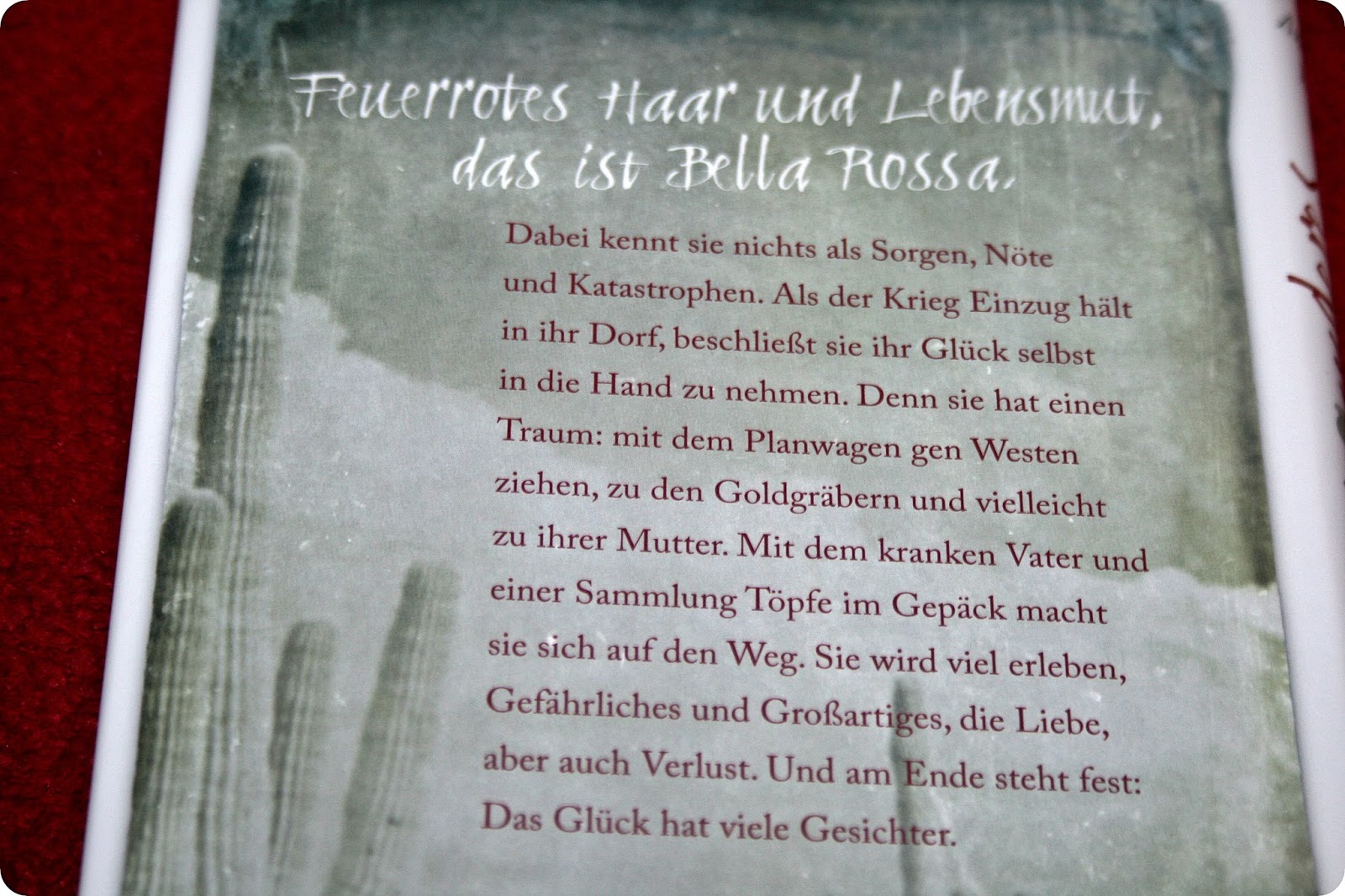 In dieser Geschichte geht es um die Protagonistin Bella Rossa. Bella Rossa hat feuerrotes Haar und einen Lebensmut, den viele bewundern, vorallem in Zeiten die schwer sind. Als der Krieg auch Einzug in ihr Heimatdorf hält beschließt Bella Rossa, dass sie ihr Glück selbst in die Hand nehmen wird, um sich ihren sehnlichsten Wunsch zu erfüllen. Sie möchte gern mit dem Planwagen losziehen, in Richtung Westen zu den Goldgräbern. Nicht zuletzt hofft sie vielleicht auch ihre Mutter zu sehen. Also macht Bella Rossa sich auf, mit ihrem kranken Vater und nur einer Sammlung von Töpfen, aber kann sie wirklich ihr Glück finden?