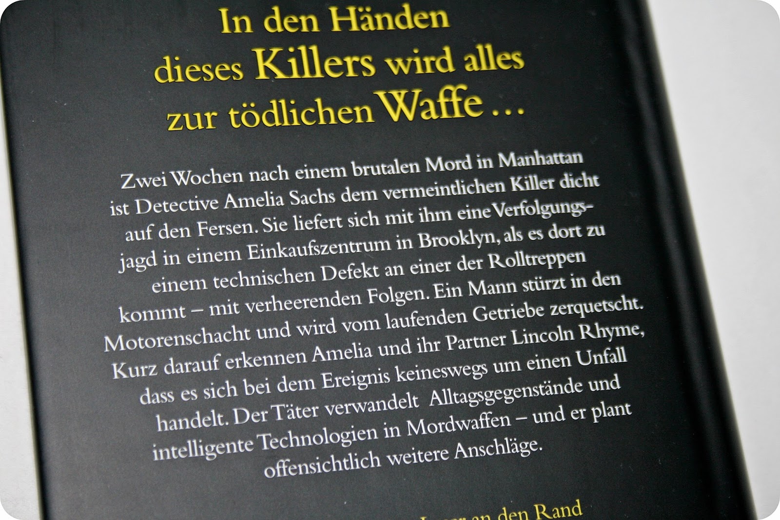 In dieser Geschichte geht es um die Protagonisten Lincoln Rhyme und Amelia Sachs. Die beiden Detectives bekommen es in diesem Band mit einem skrupellosen Täter zu tun. Als Amelia gerade einen Killer verfolgt und ihm bis in ein Einkaufszentrum in Brooklyn folgt kommt es dort zu einem technischen Defekt der Rolltreppen, in dessen Folge ein Mann stürzt und vom Getriebe zerquetscht wird. Kurz darauf erkennen Amelia und Lincoln, dass es sich nicht nur um einen Unfall handelt, sondern, dass ein Täter Alltagsgegenstände und andere Technologien in Mordwaffen verwandelt und den beiden wird schnell klar, dass er damit weitermachen wird, wenn ihn niemand aufhält …