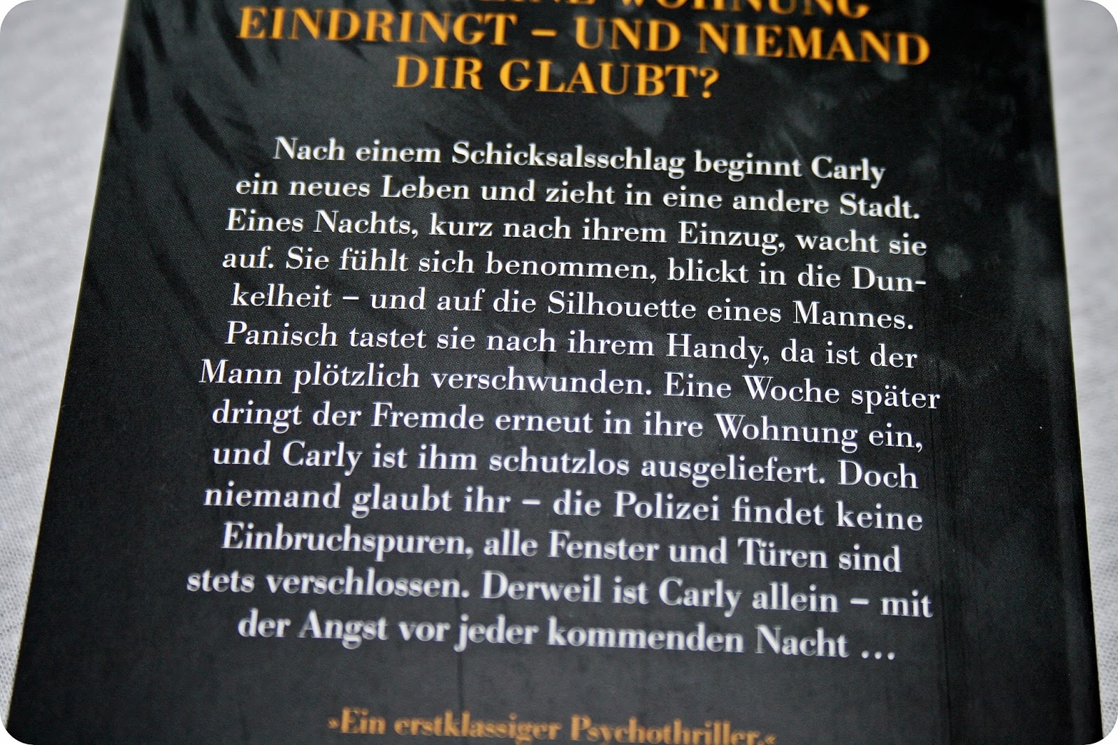 In dieser Geschichte geht es um die Protagonistin Carly Townsend. Carly hat nach einem schweren Schicksalsschlag beschlossen ein neues Leben zu beginnen. Dafür ist sie umgezogen und sie geht auch wieder zur Uni. Kurz nach ihrem Einzug hat Carly ein Schockerlebnis als sie Nachts benommen aufwacht und in der Dunkelheit einen Mann stehen sieht. Doch als sie nach ihrem Handy tastet ist der Mann plötzlich verschwunden. Eine Woche später kehrt der Eindringling zurück und Carly ist ihm völlig ausgeliefert. Da sich aber keinerlei Einbruchsspuren finden lassen, zweifelt die Polizei an ihrer Aussage und Carly ist weiterhin ganz auf sich allein gestellt …