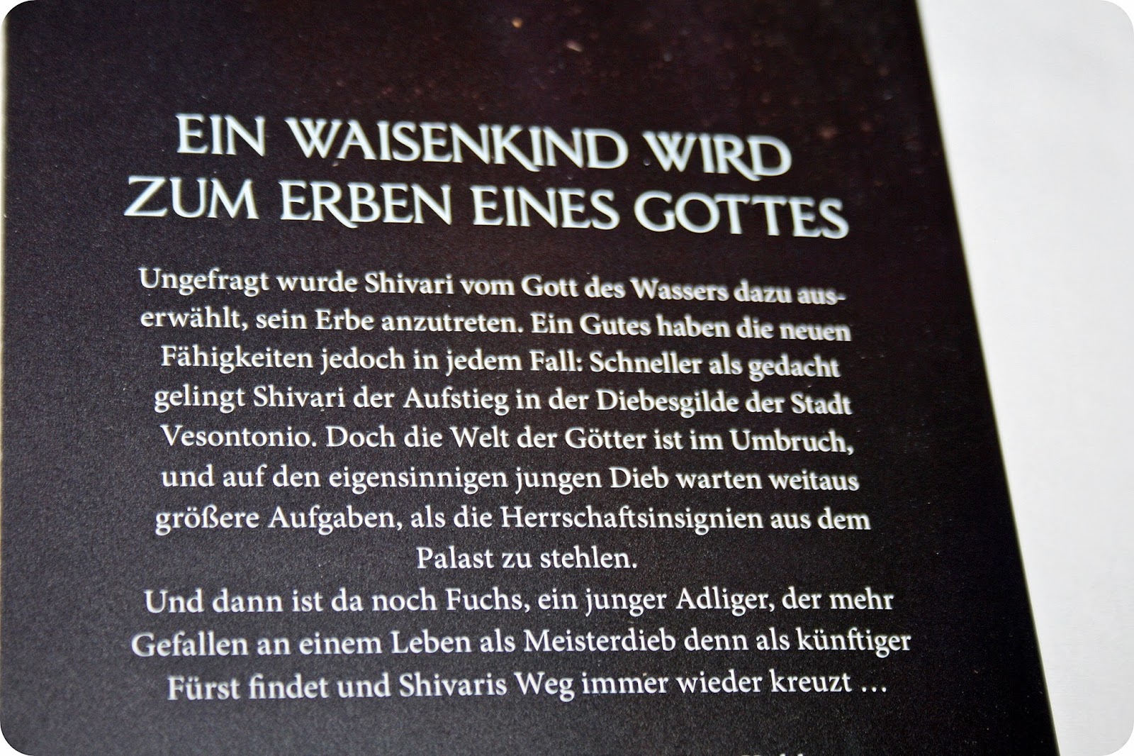 In dieser Geschichte geht es um den Protagonisten Shivari. Shivari ist der Erbe des Gottes des Wassers und das bringt für ihn auch einige neue Fähigkeiten mit sich. Durch sein neues Können gelingt es ihm auch bald innerhalb der Diebesgilde weit aufzusteigen. Doch seine Raubzüge geraten für Shivari in den Hintergrund, denn die Götterwelt befindet sich im Umbruch und auch auf Shivari warten neue Aufgaben. Zudem gibt es da auch noch Fuchs, einen jungen Adligen, der Shivari’s Weg immer wieder kreuzt …