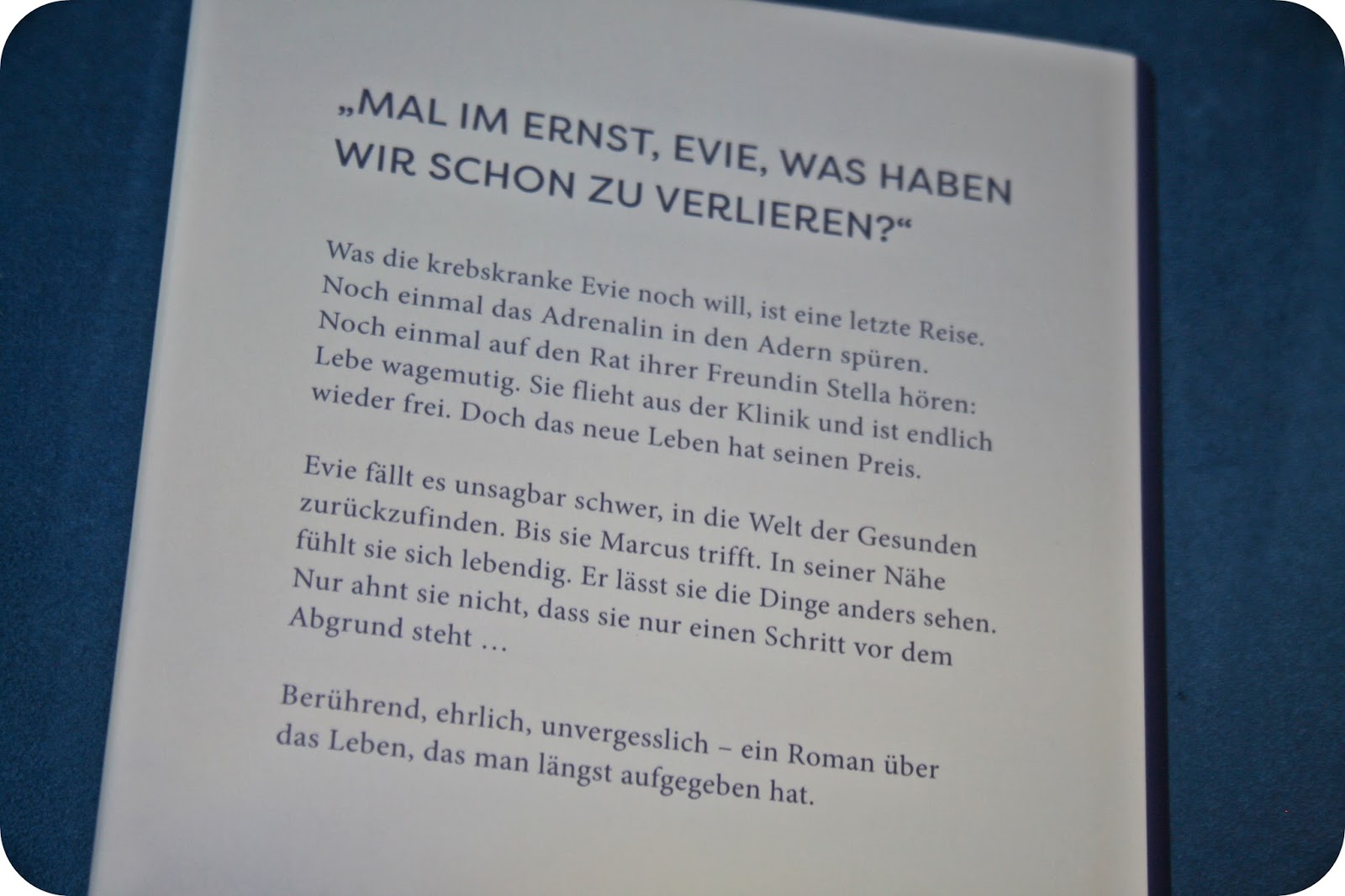 Was die krebskranke Evie noch will, ist eine letzte Reise. Noch einmal das Adrenalin in den Adern spüren. Noch einmal auf den Rat ihrer Freundin Stella hören: Lebe wagemutig. Sie flieht aus der Klinik und ist endlich wieder frei. Doch das neue Leben hat seinen Preis. Evie fällt es unsagbar schwer, in die Welt der Gesunden zurückzufinden. Bis sie Marcus trifft. In seiner Nähe fühlt sie sich lebendig. Er lässt sie die Dinge anders sehen. Nur ahnt sie nicht, dass sie nur einen Schritt vor dem Abgrund steht …