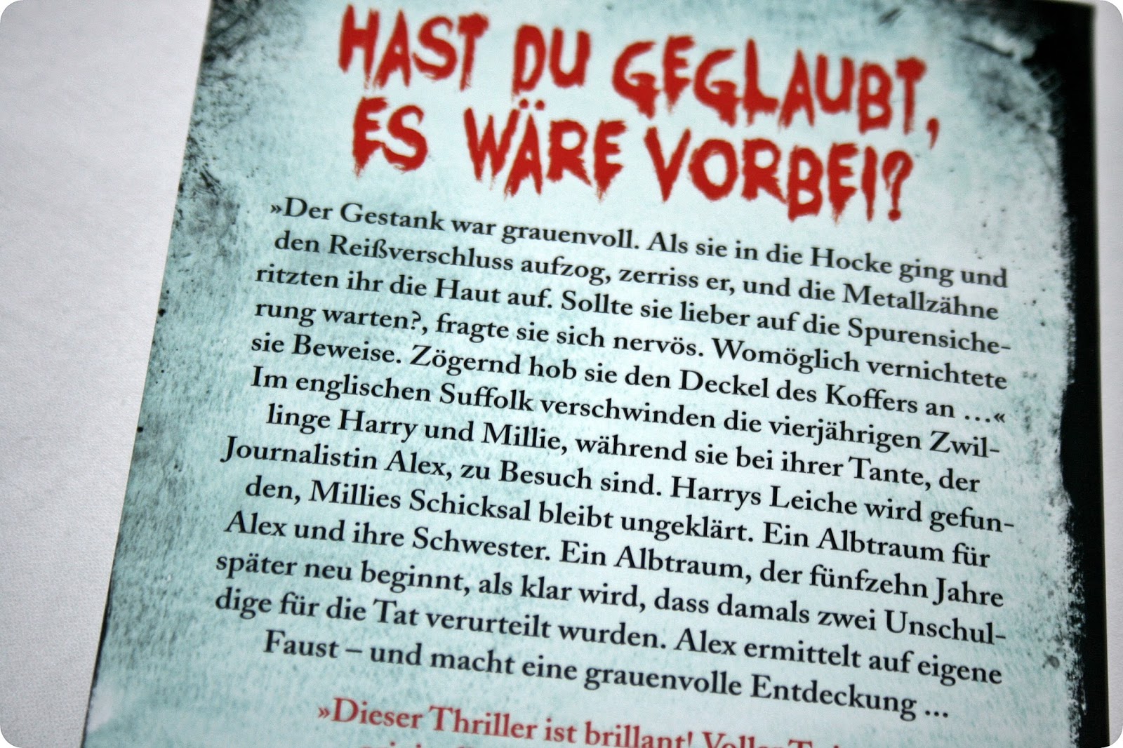 In diesem Buch geht es um die Protagonistin Alex Devlin. Alex arbeitet als Journalistin und ist alleinerziehende Mutter eines Teenagers. Sie versucht immer den Kopf über Wasser zu halten, um ihrem Kind ein gutes Leben zu bieten, aber ihr Leben ist überschattet von Schuldgefühlen. Diese rühren daher, dass vor fünfzehn Jahren die Zwillinge ihrer Schwester bei ihr zu Besuch waren und während sie die Aufsichtspflicht hatte, aus ihrem eigenen Garten entführt worden sind. Der kleine Harry wurde tot aufgefunden, aber von seiner Schwester Millie fehlt bis heute jede Spur. Alex macht sich schwere Vorwürfe und kümmert sich um ihre Schwester Sasha, die seit dem Vorfall psychisch erkrankt ist.