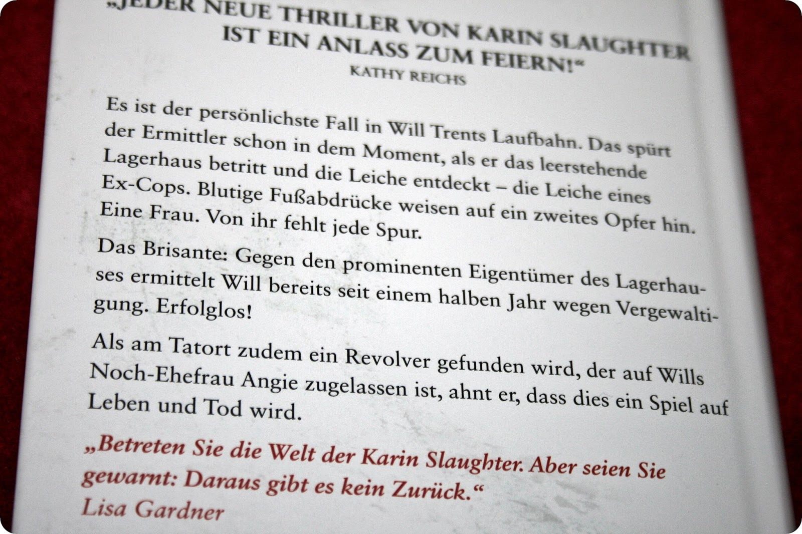 Der Einstieg in diesen Thriller ist mir sehr gut gelungen. Ich mag die Art, wie Karin Slaughter Spannung und Emotionen mischt und, dass ihre beschriebenen Fälle immer so toll vielschichtig aufgebaut sind! Die verschiedenen Handlungsstränge, bei denen man mal die aktuellen Ermittlungen und Geschehnisse erfährt und zum anderen auch in Rückblicken mehr über die Zeit und Angie’s Erlebnisse, ermöglichen dem Leser/ der Leserin einen tollen Rundumblick, der keine Fragen offen lässt und im fortlaufen der Geschichte auch den Spannungsbogen ansteigen lässt.