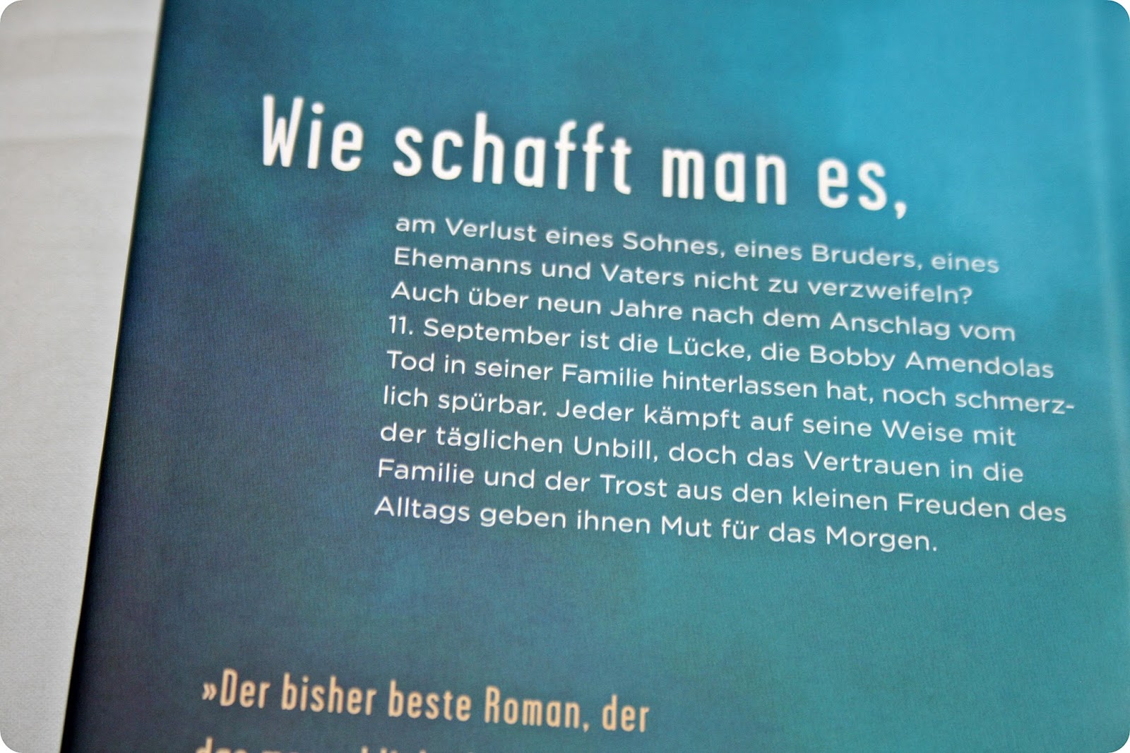 Die Handlung ist ansonsten gut aufgebaut, aber ich finde, dass das Buch ein bisschen mehr verspricht, als es letztlich beinhaltet. Ich hatte mir mehr Emotionen und auch mehr Rückblicke gewünscht, die es so leider nicht gegeben hat! Die Familienkonstellation und bestimmte Schicksale der Charaktere waren schon teilweise emotional, aber die eigentliche Thematik des 9/11 kam mir hier zu kurz, beziehungsweise, es waren für meinen Geschmack, nicht genügend Verknüpfungen!