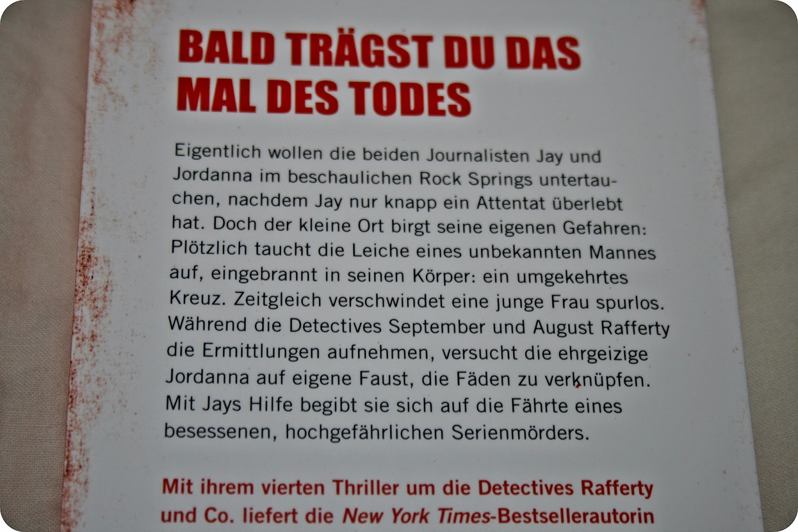 Der Einstieg in diesen Thriller ist mir sehr gut gelungen. Der Schreibstil von Nancy Bush hat mir wieder gut gefallen, da sie flüssig schreibt und es ihr einfach toll gelingt eine unterschwellige Spannung aufzubauen und weitestgehend auch aufrecht zu halten. In diesem Buch stößt man als Leser/Leserin auf drei verschiedene Erzählstränge. Im Vordergrund steht der Erzählstrang, um Jay und Jordanna, aber es gibt zudem auch Einflechtungen, mit den Gedankengängen des Täters und auch wenige Einblicke in Welt und den Alltag der Raffertys. Diese Abwechslung hat mir gut gefallen, auch wenn ich manchmal das Gefühl hatte, das dadurch ein Erzählstrang, nämlich der um die Saldano’s ein bisschen zu kurz kam und dadurch fast wie eingestreut wirkte.