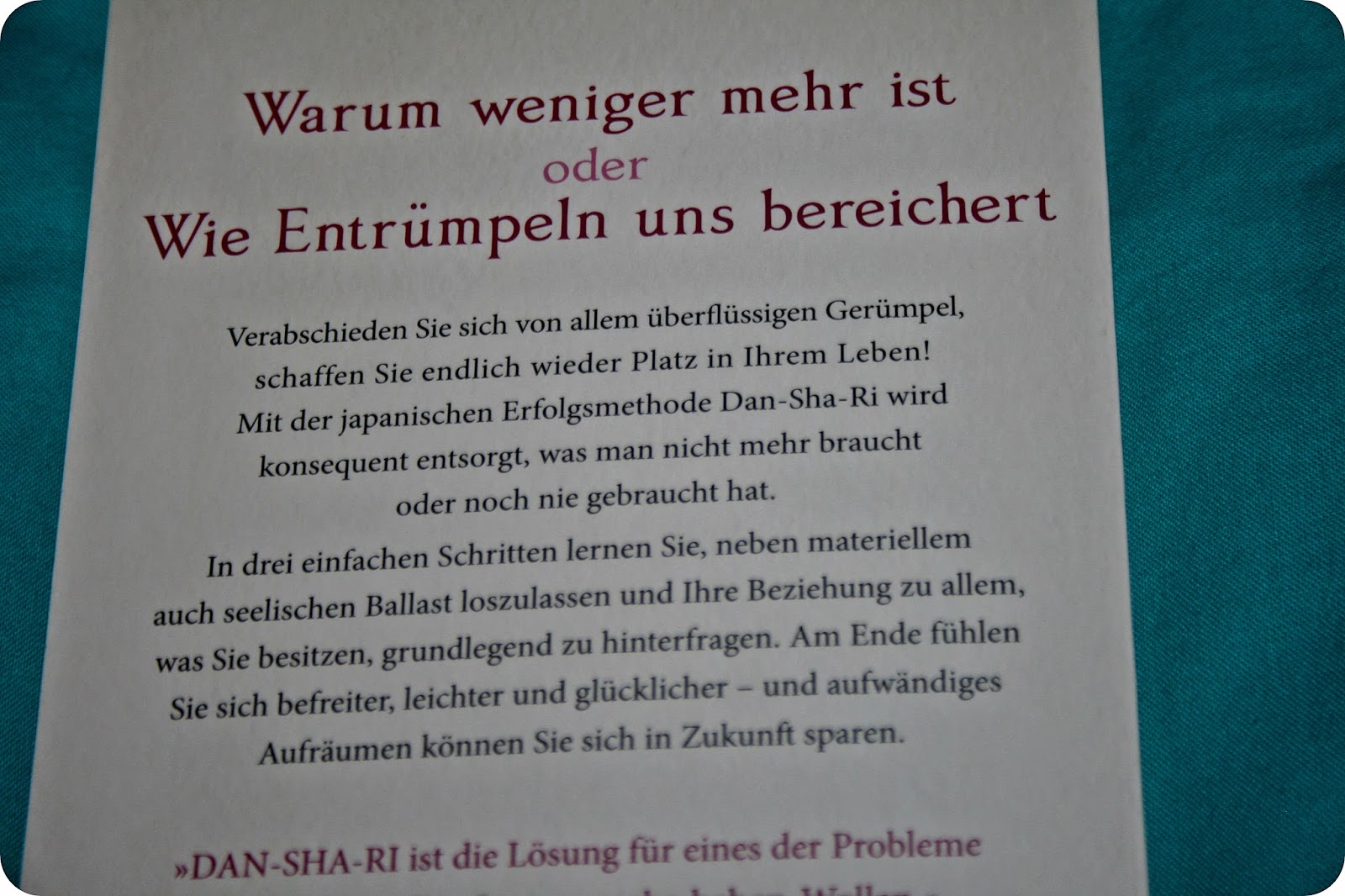 “Dan – Sha – Ri – Das Leben entrümpeln, die Seele befreien” hat mir schon während des Lesens so gut gefallen, dass ich die Tipps gleich umsetzen wollte! Die Methode ist einfach und dabei wirklich hiflreich!