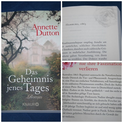 “Das Geheimnis jenes Tages” ist ein Roman der Autorin Annette Dutton. Das Buch erzählt von der Protagonistin Nadine. Nadine ist Archäologie – Professorin und Mutter einer 18 jährigen Tochter, namens Alina. Die Protagonistin wird damit beauftragt, Knochenartefakte an einen Aborigineestamm zurückzugeben, die deutsche Wissenschaftler im 19. Jahrhundert unrechtmäßig an sich gebracht haben sollen. Auch die bekannte Naturforscherin und Sammlerin Amalie Dietrich war bei der Gruppe der Wissenschaftler dabei.