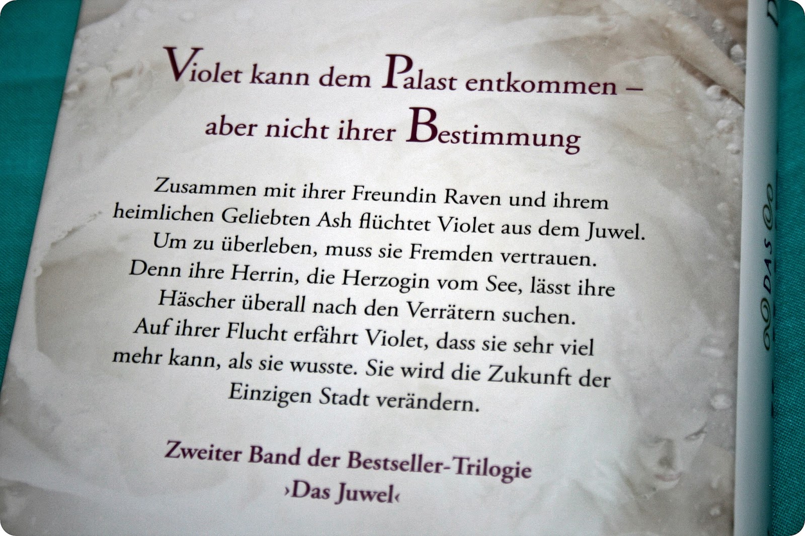 Zusammen mit ihrer Freundin Raven und ihrem heimlichen Geliebten Ash flüchtet Violet aus dem Juwel. Um zu überleben, muss sie Fremden vertrauen. Denn ihre Herrin, die Herzogin vom See, lässt ihre Häscher überall nach den Verrätern suchen. Auf ihrer Flucht erfährt Violet, dass sie sehr viel mehr kann, als sie wusste. Sie wird die Zukunft der Einzigen Stadt verändern.