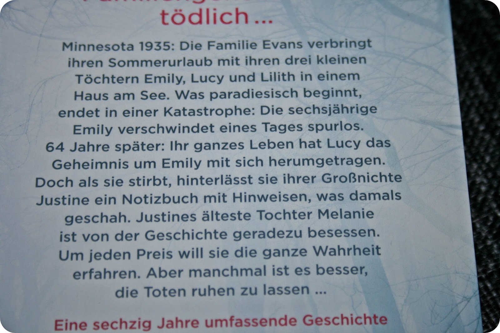 Die Geschichte beginnt in Minnesota im Jahr 1935 und der Leser/ die Leserin begegnet dort der Familie Evans. Die Evans verbringen ihren Sommerurlaub mit ihren drei Töchtern Emily, Lucy und Lilith an einem idyllischen See. Doch nicht nur innerhalb der Familie kommt es manchmal zu Spannungen und die Ferien enden mit einem Schlag, als die jüngste Tochter Emily spurlos verschwindet.