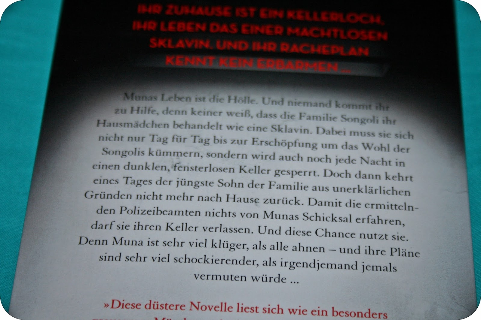 Aber auch wenn sie nur wenig sprechen darf, ist Muna ziemlich klug, sie achtet auf sehr vieles und hat sich manches selber beigebracht. Doch eines Tages wird alles anders, als der jüngste Sohn der Songolis spurlos verschwindet. Damit die ermittelnden Polizeibeamten nichts von Muna’s eigentlichen Lebensbedingungen erfahren, darf sie aus dem Keller in ein anderes Zimmer ziehen und bekommt auch richtige Kleidung. Muna sieht immer mehr, dass das ihre einzige Chance sein könnte und so beobachtet und lernt sie, um sich schließlich an denen rächen zu können, die sie so geqüalt haben …