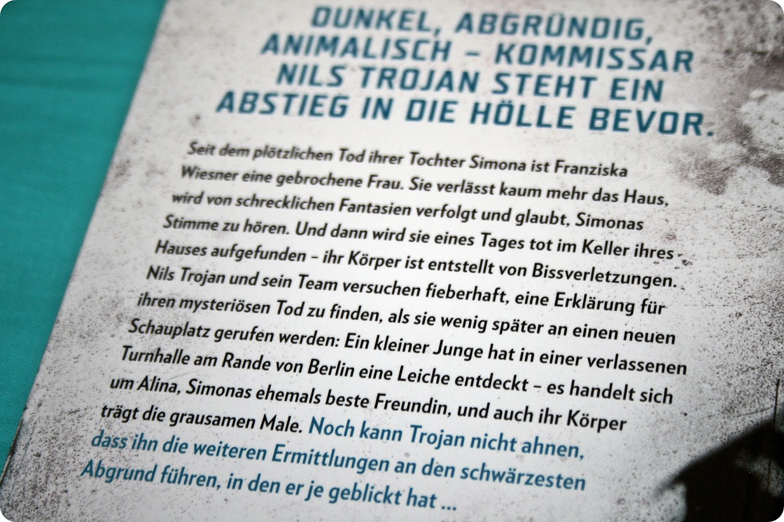 Besonders Simona’s Mutter leidet stark und das Trauma führt dazu, dass sie Bilder sieht und auch Simona’s Stimme hört.Fast genau ein Jahr später wird Simona’s Mutter grausam getötet und es finden sich einige rätselhafte Bissspuren auf ihrem Körper. Nils Trojan, der eigentlich seinen Urlaub geniessen sollte, stürzt sich natürlich mit seinem Team in den neuen Fall und als auch Alina tot aufgefunden wird, wird spätestens allen klar, dass sie es mit einem besonders grausamen Mörder zu tun haben, der unbedingt gestellt werden muss …