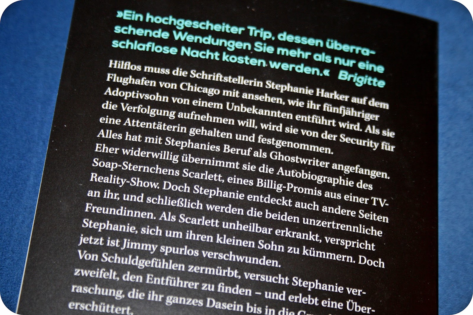 Hilflos muss die Schriftstellerin Stephanie Harker auf dem Flughafen von Chicago mit ansehen, wie ihr fünfjähriger Adoptivsohn von einem Unbekannten entführt wird. Als sie die Verfolgung aufnehmen will, wird sie von der Security für eine Attentäterin gehalten und festgenommen. Alles hat mit Stephanies Beruf als Ghostwriter angefangen. Eher widerwillig übernimmt sie die Autobiographie des Soap-Sternchens Scarlett, eines Billig-Promis aus einer TV-Reality-Show. Doch Stephanie entdeckt auch andere Seiten an ihr, und schließlich werden die beiden unzertrennliche Freundinnen. Als Scarlett unheilbar erkrankt, verspricht Stephanie, sich um ihren kleinen Sohn zu kümmern. Doch jetzt ist Jimmy spurlos verschwunden. Von Schuldgefühlen zermürbt, versucht Stephanie verzweifelt, den Entführer zu finden – und erlebt eine Überraschung, die ihr ganzes Dasein bis in die Grundfesten erschüttert.