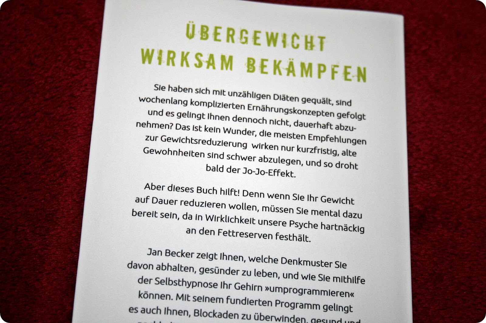 Auf dieses Buch war ich schon sehr gespannt, da ich die Thematik interessant finde und neugierig auf die Inhalte war. Klar, das Thema ist nicht neu, aber von Jan Becker kannte ich noch nichts. Das Buch ist eine gute Mischung aus altbekannten Abnehmtipps, einigen psychologischen Tipps und natürlich Hypnosen.