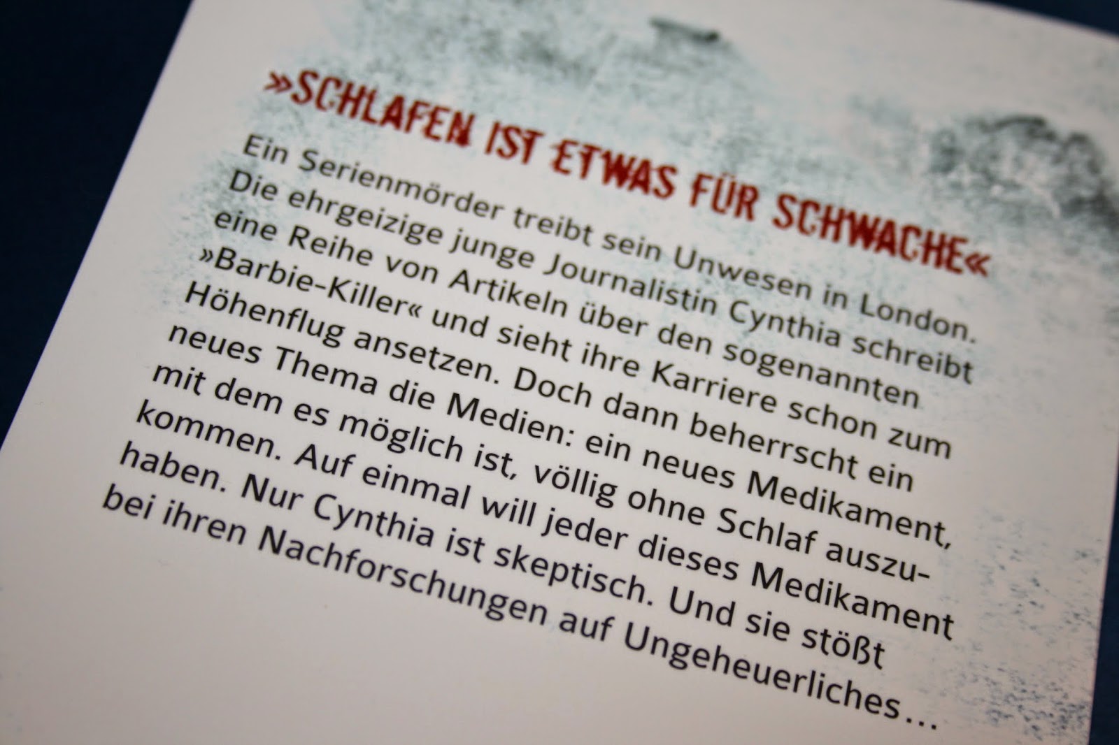 “Du sollst nicht schlafen” ist ein Thriller von Charlotte Parsons. In diesem spannenden Buch geht es um die Journalistin Cynthia Wills die über einen Mord an einer jungen Frau berichten soll. Nach kurzer Zeit findet sie heraus, dass es früher schoneinmal ähnliche Morde gegeben hat und beginnt weiter zu recherchieren. Zusätzlich schreibt sie eine Artikelserie über den sogenannten “Barbie-Killer”und hofft dadurch ihrer Karriere einen Schub zu geben.