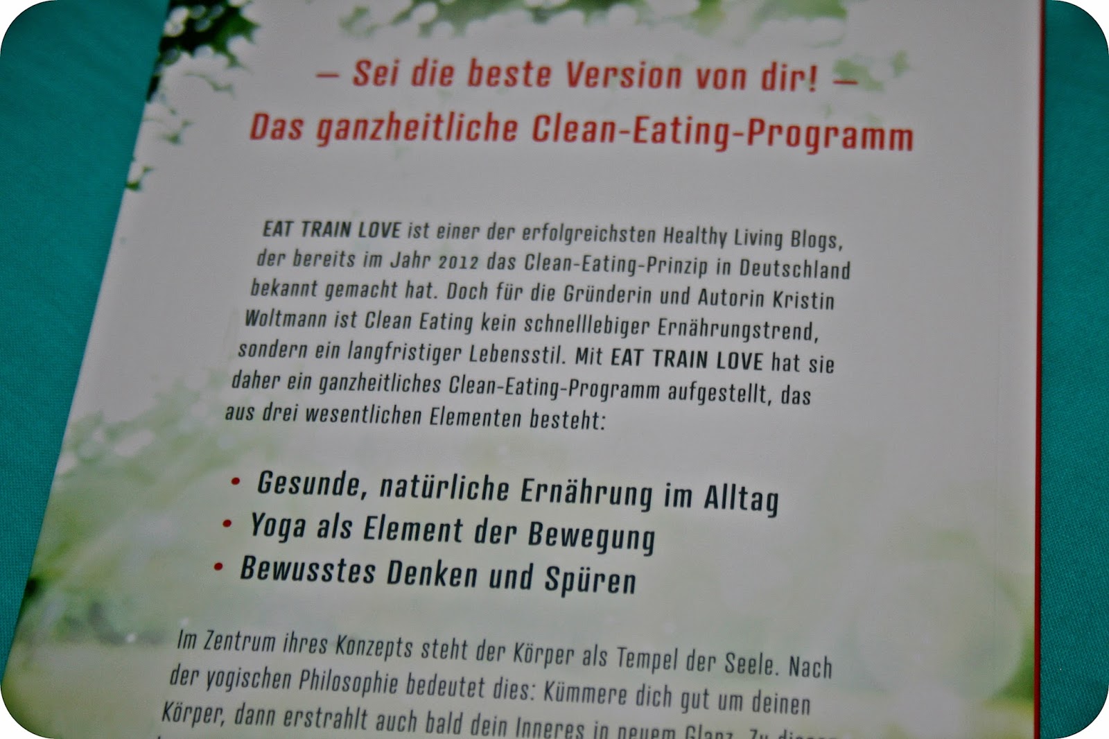 “Eat Train Love” ist ein Ratgeber der Autorin und erfolgreichen Healthy Living Bloggerin Kristin Woltmann. In diesem Buch geht es um das Thema “Clean Eating”. Bereits im Jahr 2012 machte die Autorin das Clean – Eating – Prinzip in Deutschland bekannt, indem sie es auf ihrem Blog vorstellte. Das besondere und das was dieses Buch von anderen unterscheidet ist, dass Kristin Woltmann es als langfristigen Lebensstil in ihren Alltag integriert hat, anstatt es als eine kurzlebige und ebenso kurzzeitig effektive Methode zu handhaben. Zudem ist es bei ihrem Clean – Eating – Programm so, dass sie dort nicht nur die Ernährung, sondern auch andere wichtige Elemente miteinander kombiniert.