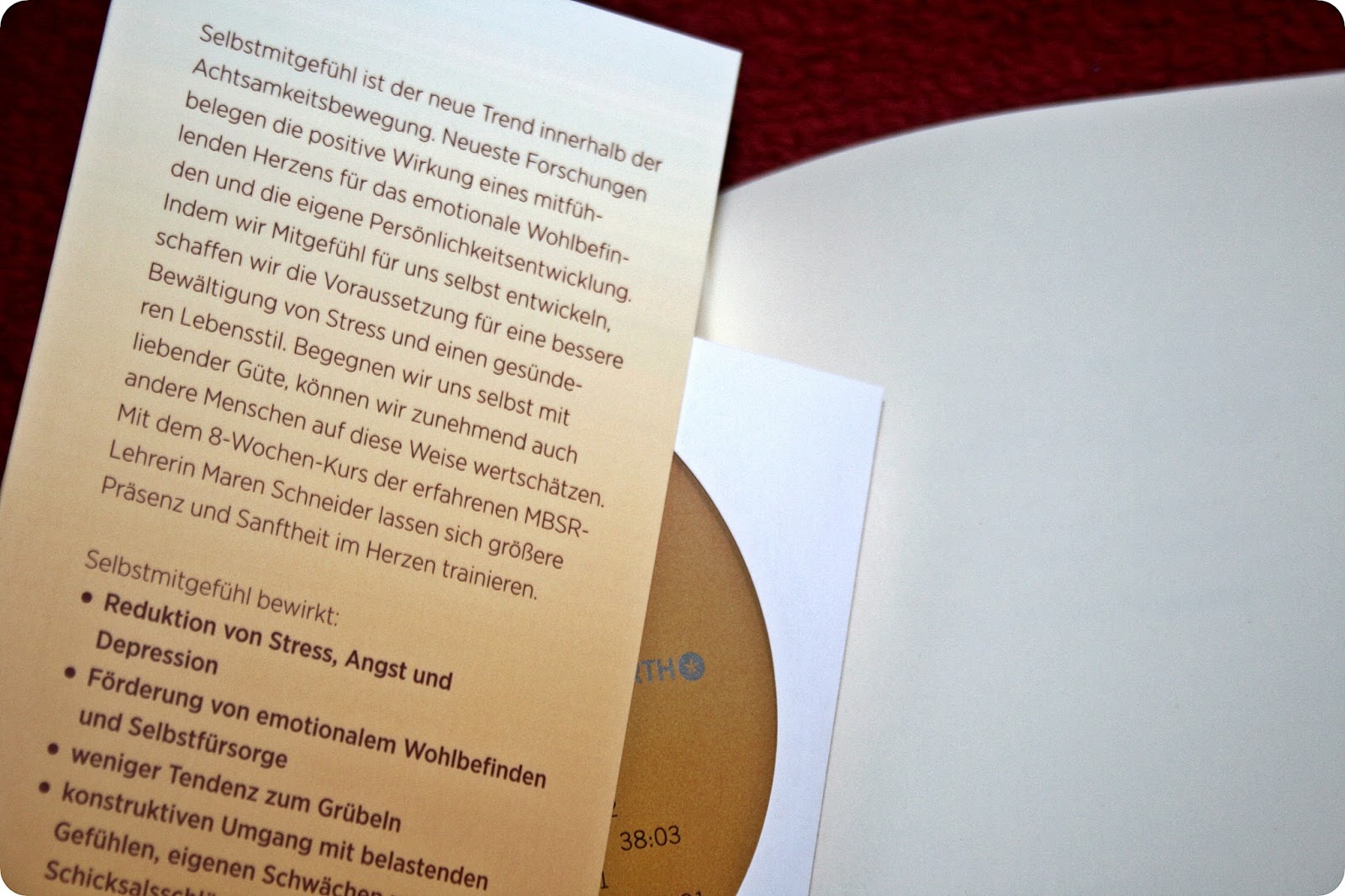 Jedes Kapitel beinhaltet ein anderes übergeordnetes Thema, angefangen mit den wissenswerten Erklärungen was Selbstmitgefühl überhaupt ist und was es bewirken soll. Zu ein paar Seiten zum jeweilige Thema gibt es dann auch immer noch ein oder zwei Aufgaben in Form von Meditationen. Hier fand ich es sehr toll, dass jede Übung und jede Meditation auch auf den zwei ( ! ) beiliegenden Audio Cd’s zu finden ist. Sie sind eine wichtige Ergänzung zu den, auch geschrieben, vorliegenden Inhalten!