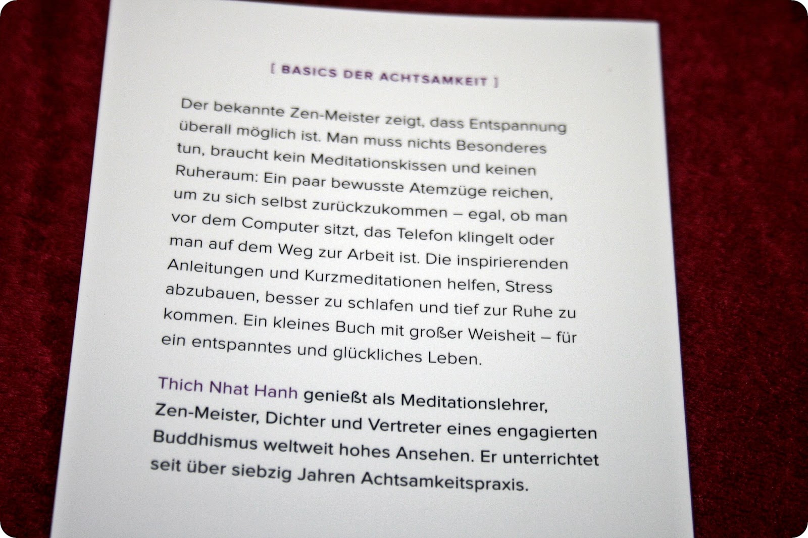 Hier findet der Leser/die Leserin konkrete und leicht umzusetzende Anweisungen des Autors, wie es jedem Menschen gelingen kann, Achtsamkeit in seinen Alltag zu integrieren. Was mir besonders gut gefallen hat ist, dass das Büchlein auch perfekt zum mitnehmen ist und in jede Handtasche passt. So kann man sich die Hinweise zum Entspannen immer wieder in Erinnerung rufen, oder Dinge nochmal verinnerlichen.