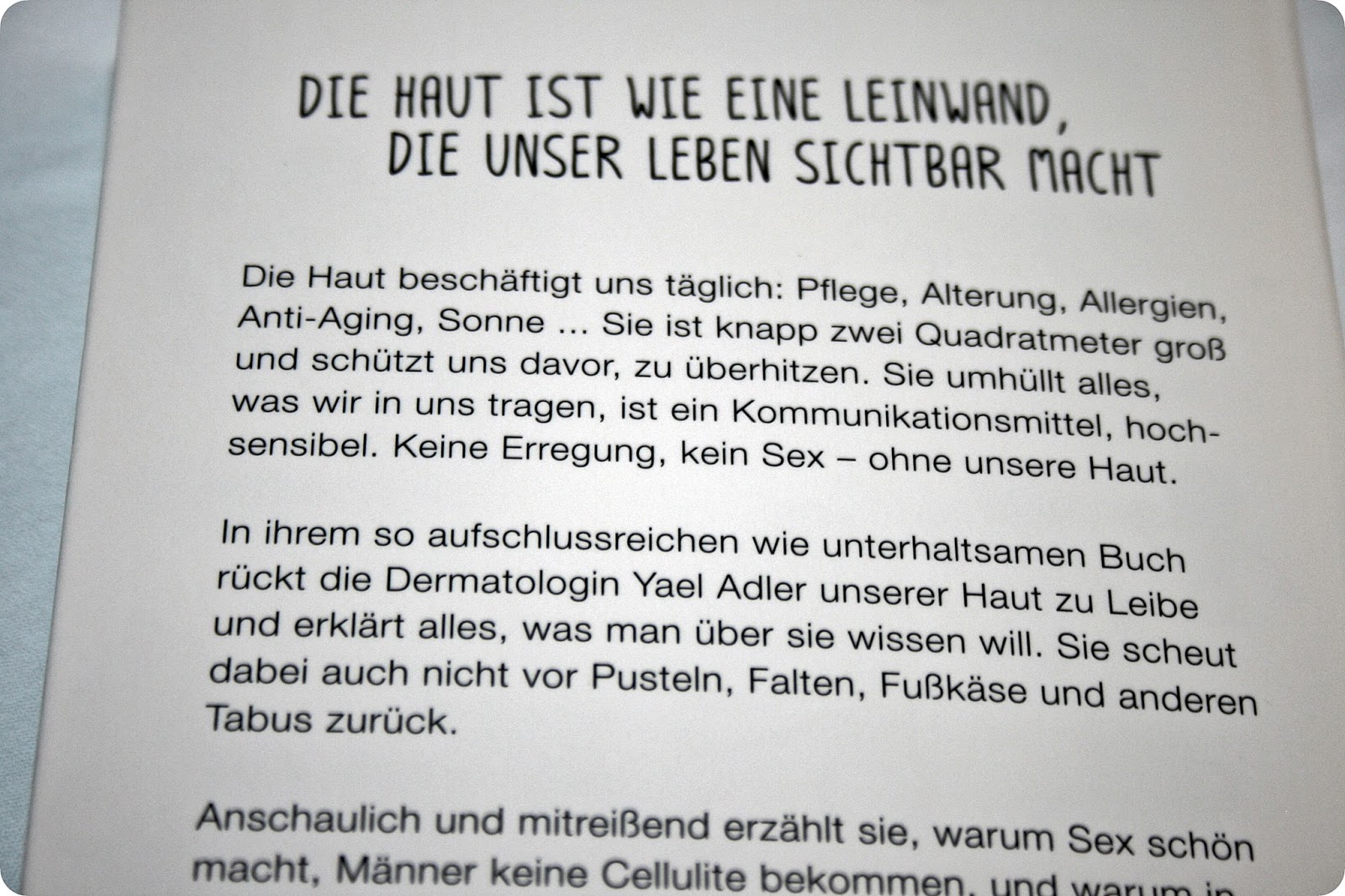 “Haut nah” ist ein Ratgeber/Sachbuch der Autorin und Dermatologin Dr. med. Yael Adler. In diesem Buch berichtet die sympathische Ärztin alles wissenswerte zum Thema Haut, die immerhin das größte Organ des Menschen ist. Ich war sehr neugierig auf das Buch, da ich ja berufsbedingt schon einiges weiß, aber doch längst nicht alles.
