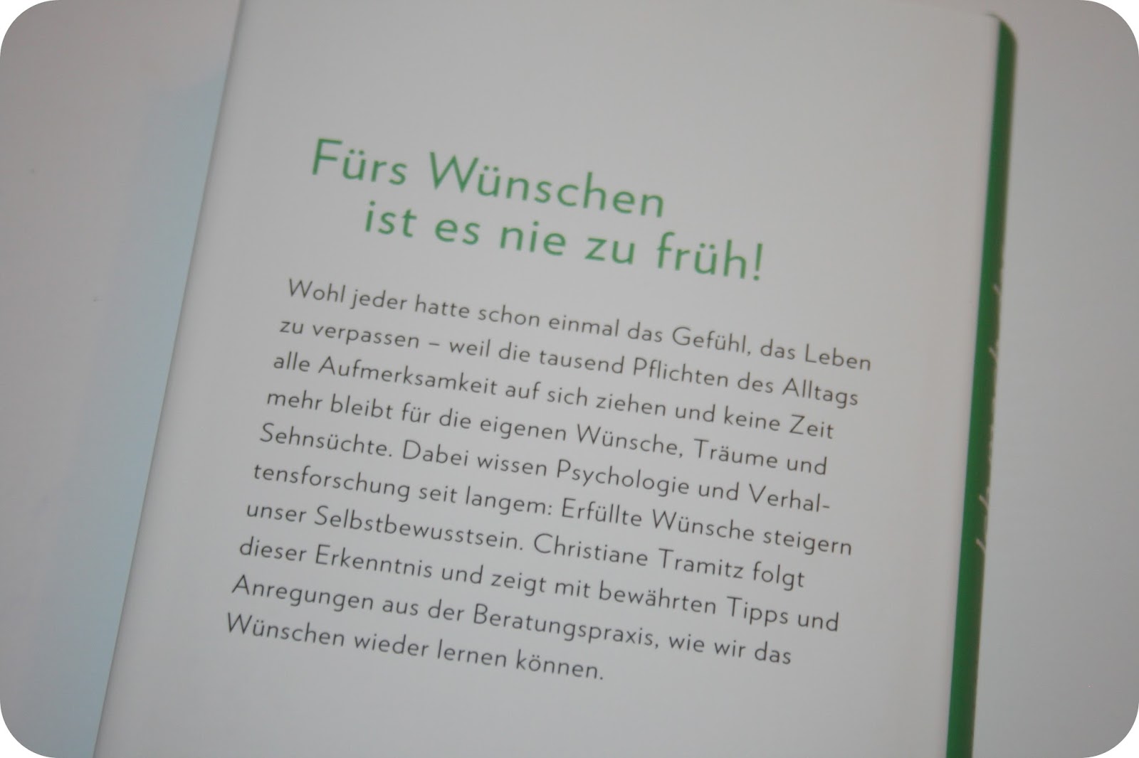 In diesem Buch befasst sich Frau Tramitz mit dem großen Thema des Wünschens, in allen seinen Facetten. So erläutert sie beispielsweise was unterdrückte Wünsche, Sehnsüchte oder Träume in einem Menschen auslösen. Hier zum Beispiel Frust, Traurigkeit, niedriger Selbstwert etc. Im Gegensatz dazu schildert die Autorin, dass ein erfüllter Wunsch schon das Selbstbewußtsein steigen lässt. Aber nicht nur das Pro und Kontra des Wünschens bringt die Autorin dem Leser/ der Leserin näher, sondern sie erklärt auch, wie man das überhaupt erreichen kann.