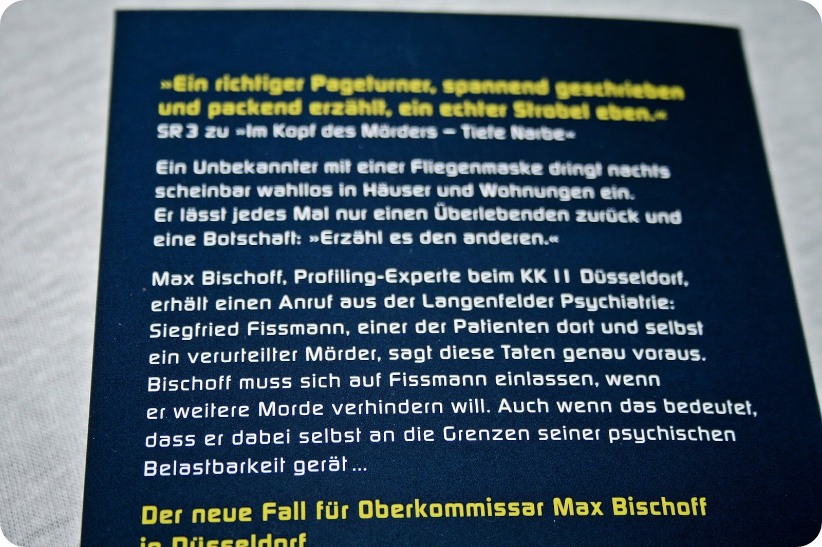 Im letzten Drittel des Buches nimmt die Handlung dann deutlich an Fahrt auf und die Auflösung fand ich schön überraschend, was toll war. Auch die Emotionen kommen durch die bestialischen Taten immer wieder zum tragen. Bei Max Bischoff würde ich mir für den nächsten und abschließenden Teil eine noch deutlichere Entwicklung wünschen, aber ansonsten konnte mich der Autor mit den emotionalen Passagen schon überzeugen.