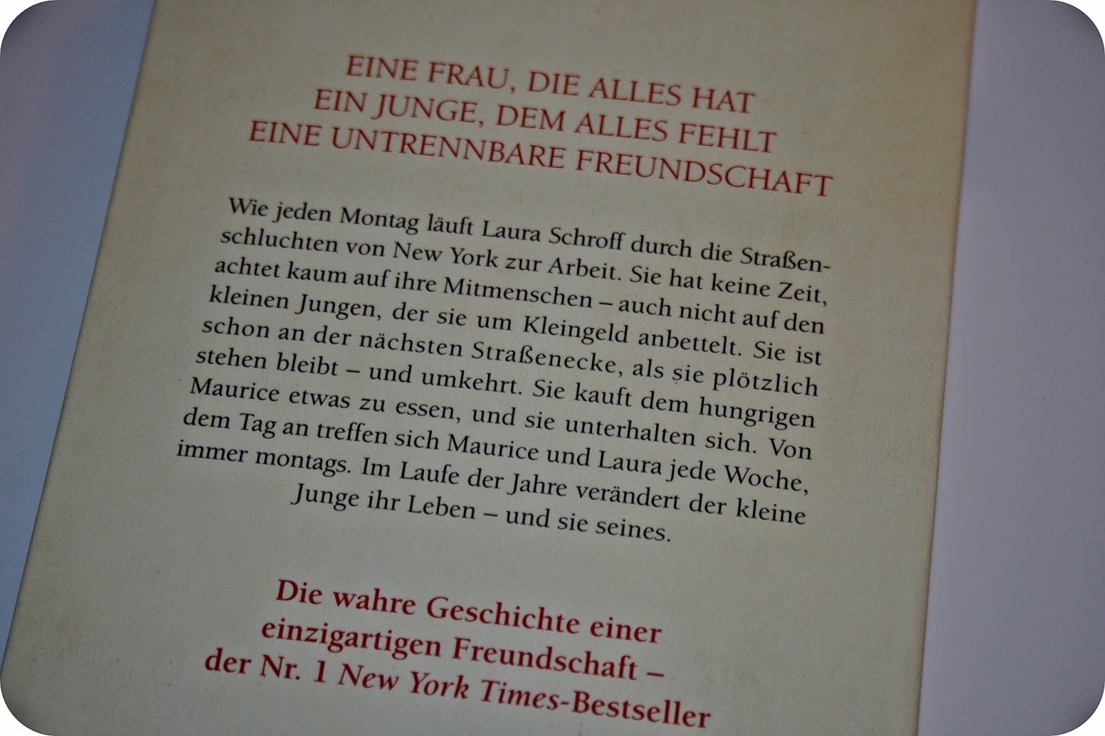 “Immer Montags beste Freunde” ist ein Roman von Laura Schroff und Alex Tresniowski. In diesem Buch erzählen die Autoren die wahre Geschichte über ihr Kennenlernen und wie sich daraus über die Jahre eine anhaltende Freundschaft entwickelt hat. Laura Schroff ist eine sehr erfolgreiche Geschäftsfrau und zu ihrem Job, als Verkaufsleiterin, hetzt sie auch an jenem Montag durch die Straßen von New York. Mit dem Gedanken schon auf der Arbeit, achtet sie scheinbar auf nichts und niemanden, auch auf den kleinen Jungen nicht, der sie um etwas Kleingeld anbettelt. Doch an der nächsten Straßenecke bleibt Laura plötzlich abrupt stehen, dreht um und kauft dem Jungen etwas zu essen. Dass dies der Beginn einer wunderbaren und besonderen Freundschaft ist, kann zu diesem Zeitpunkt noch keiner der beiden auch nur ahnen …