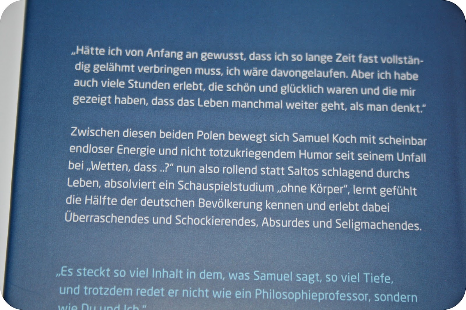 Fünf Jahre liegt Samuel’s Unfall bereits zurück und dieses Buch ist eine tolle Autobiographie, die wiederspiegelt, wie sich sein Leben nach dem Unfall weiterentwickelt. Samuel berichtet über sein Schauspielstudium und welche Erfahrungen er dadurch machen konnte und wie sie ihn verändert haben. Man erfährt als Leser/Leserin aber auch wie Samuel’s Alltag aussieht. Er ist auf Unterstützung in sehr vielen Lebensbereichen angewiesen und er beschreibt dies so, dass man als Leser/Leserin gar nicht anders kann als mitzufühlen.