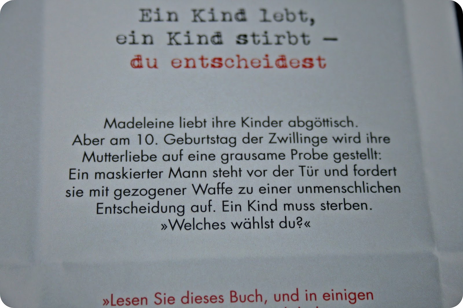 In dieser Geschichte geht es um die Protagonistin Madeleine, auch Maddy genannt. Maddy ist glücklich in ihrer Rolle als Ehefrau von Dom und Mutter ihrer gemeinsamen Zwillinge. Voller Vorfreude steht sie am Morgen des zehnten Geburtstags der beiden auf und freut sich an dem Überschwang ihrer Zwillinge. Doch als plötzlich ein maskierter Mann vor der Tür steht und Maddy, mit gezogener Waffe, zwingt ein Kind zu wählen, welches sterben soll, während das andere leben kann, verliert Maddy den Boden unter den Füssen …