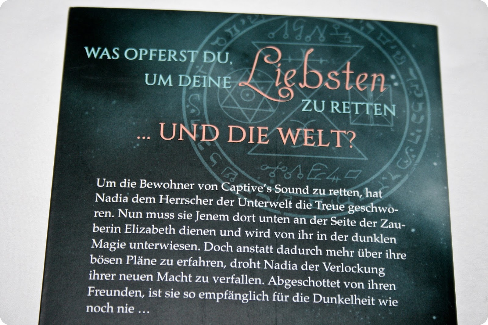 Nachdem Nadia im zweiten Band dem Herrscher der Unterwelt ( Jenem dort unten ) die Treue geschworen hat, hat sich ihr Leben komplett verändert. Zwar hat sie es getan, um die Bewohner von Captive’s Sound zu retten, aber sie musste dafür einen Teil ihrer Selbst aufgeben und fortan ist sie gezwungen Elizabeth Pike, der Hexe, die die schwarze Magie blind beherrscht, zu dienen.