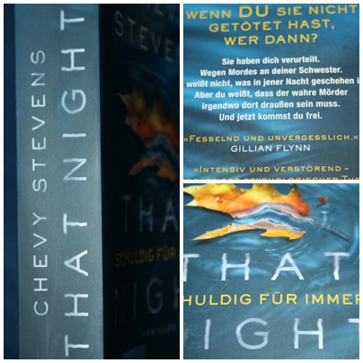 “That Night – Schuldig für immer” ist ein Thriller der Autorin Chevy Stevens. In diesem Buch geht es um die Protagonistin Toni Murphy.  Toni wurde mit 18 Jahren für den Mord an ihrer jüngeren Schwester Nicole verurteilt und saß seitdem im Frauengefängnis. Jetzt ist sie gerade auf Bewährung draußen und sie hat nur zwei Wünsche: Sie möchte sich ein normales Leben aufbauen und vorallem möchte sie den wahren Mörder ihrer Schwester finden. Denn Toni weiß sicher, dass sie Nicole nicht getötet hat, zumindest behauptet sie das immer wieder. Doch was wirklich in der Nacht am See mit Nicole geschah liegt im Dunkeln. Sind Toni und ihre große Liebe Ryan wirklich so unschuldig wie sie behaupten?