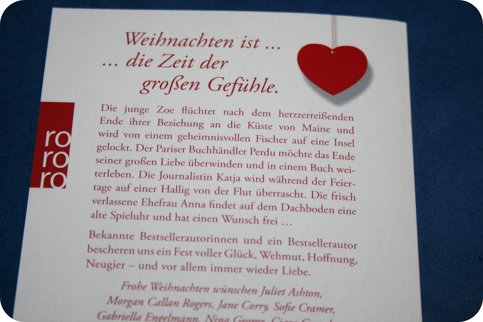 “Weihnachtsherzen – Die schönsten Geschichten zum Fest” ist ein Buch mit vielen Geschichten verschiedener Autoren, herausgegeben von Anne Tente. Die Autorinnen sind zum Beispiel Nina George, Gabriella Engelmann, Sofie Cramer oder Juliet Ashton und andere. Alles bekannte Autorinnen und ein Autor, und von vielen habe ich schon etwas gelesen und für gut befunden. Aus diesem Grund fand ich dieses Buch in der Winter- Weihnachtszeit auch so interessant.